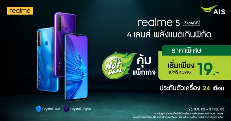 realme จัดโปรสุดแรง ซื้อ realme 5 กับ AIS ในราคาเกินคุ้ม 19 บาท พร้อมแพ็กเกจโดนใจ เน็ต 30 GB โทรฟรี 24 ชั่วโมง !!!
