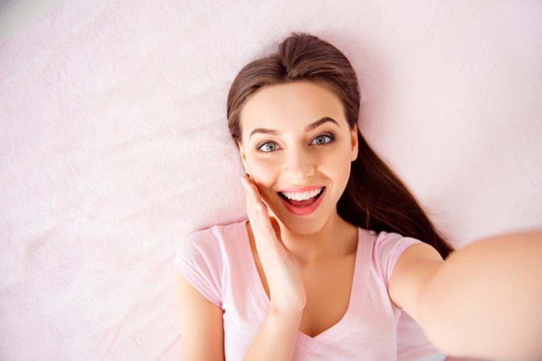 Self top above view portrait of pretty, brunette, charming, cute, glad, pleased, positive girl holding palm near cheek looking at camera, shooting selfie on front camera, lying on back on bed