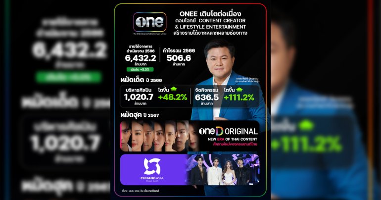 “เดอะ วัน เอ็นเตอร์ไพรส์” สรุปงบรายได้จากการดำเนินงานปี 2566 รวม 6,432.2 ล้านบาท กำไรสุทธิ 506.6 ล้านบาท เติบโต 5.0% จากปีก่อน