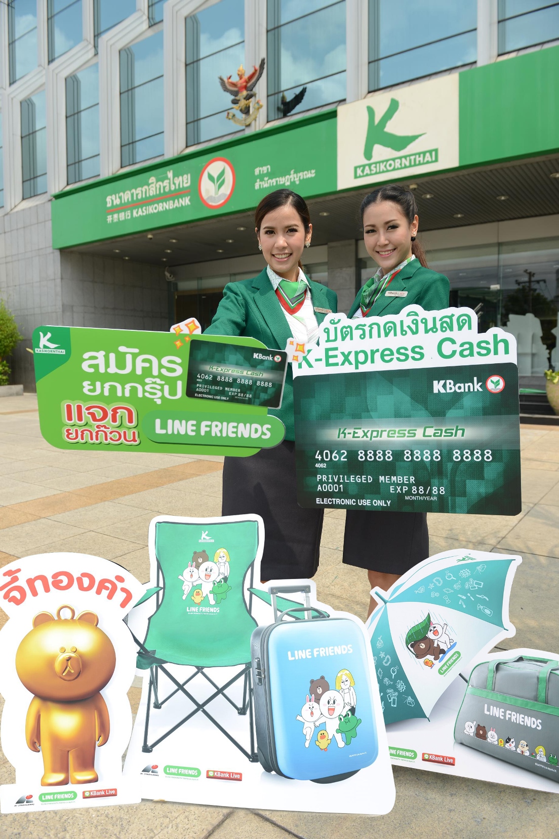 ธนาคารกสิกรไทย เปิดแคมเปญ “สมัครยกกรุ๊ปแจกยกก๊วน LINE FRIENDS กับบัตรกดเงินสด K-Express Cash” เพียงชวนเพื่อนใน LINE หรือคนรู้จักรวมกลุ่มตั้งแต่ 2-20 คน สมัครบัตรกดเงินสด K-Express Cash (สินเชื่อเงินสดทันใจกสิกรไทย) พร้อมสมัครบริการชำระเงินโดยการหักบัญชีอัตโนมัติ และลงทะเบียนเข้าร่วมโครงการผ่านเว็บไซต์ www.kasikornbank.com/kexpresscash
