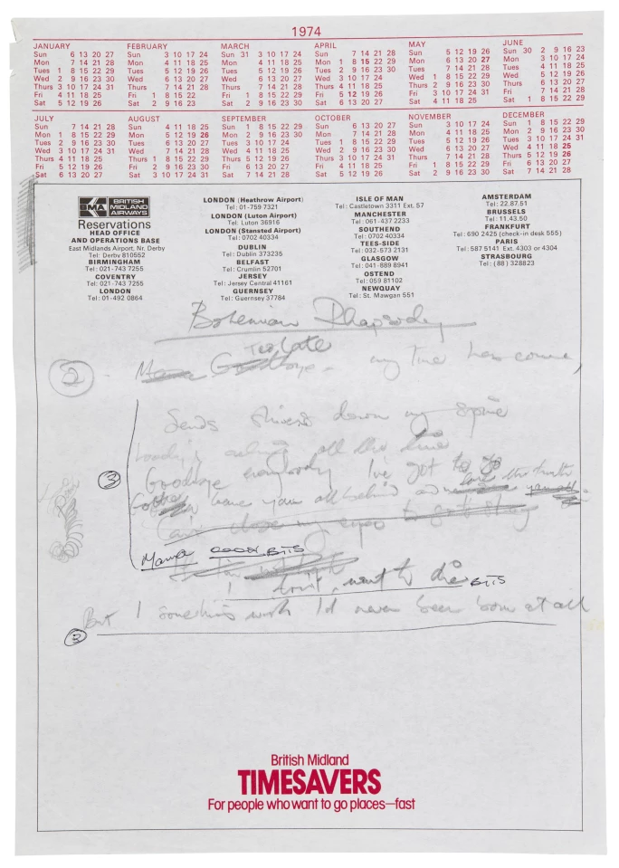 ต้นฉบับร่างเนื้อเพลง “Bohemian Rhapsody” ของวง Queen ได้เผยให้เห็นว่าเดิมทีเพลงนี้มีชื่อและเนื้อร้องที่ต่างออกไป