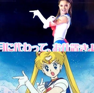 Evgenia เริ่มโชว์วาดลวดลายด้วยชุดนักเรียนญี่ปุ่นธรรมดา แต่หลังจากนั้นเธอก็เริ่มเปลี่ยนชุดนักเรียนดึงเสื้อและกระโปรงตัวนอกออก และดึงถุงน่องขึ้นเป็นสีแดง กลายร่างเป็น “Sailor Moon” (เซเลอร์มูน) ตัวการ์ตูนฮีโร่สาวสวยที่เป็นที่ชื่นชอบของใครหลาย ๆ คน กับประโยคฮิตติดหู “มนต์แห่งจันทราจงแสดงฤทธา ณ บัดนี้” ก่อนจะจบการแสดงด้วยท่าประจำตัวของเซเลอร์มูนอย่างสวยงาม สร้างความประทับใจและเรียกเสียงปรบมือให้กับสาว Evgenia ได้ยาวนานเกือบ 1 นาทีเลยทีเดียว
