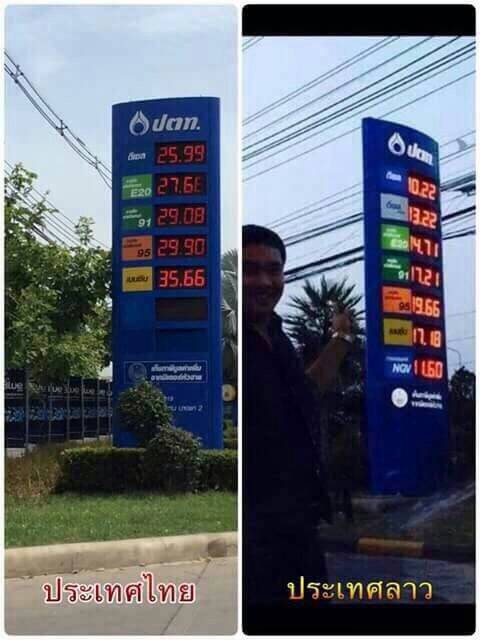 ซึ่งเมื่อเทียบราคาน้ำมันในวันนี้ในไทยและลาว ([อ้างอิงข้อมูลจากเว็บรัฐวิสาหกิจน้ำมันเชื้อไฟลาว โดยอิงราคาในเขตนครหลวงเวียงจันทร์) ได้ดังต่อไปนี้