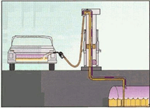 - ภายในท่อจ่ายน้ำมันจะมีท่อส่งกลับน้ำมัน ( สีดำ) เมื่อเต็มน้ำมันเต็มถังแล้ว ลิ้นหัวจ่ายน้ำมันที่ตัวปั๊มจ่ายน้ำมันจะถูกปิด ขณะเดียวกัน วาลว์ส่งกลับน้ำมันที่ตัวปั๊มนั้น จะเปิดเพื่อให้น้ำมันที่ค้างในท่อจ่ายน้ำมันไหลกลับคืนเข้าสู่ถังน้ำมันใต้ดิน โดยน้ำมันที่ค้างในมือจ่ายและท่อจ่ายน้ำมันนั้น ได้ผ่านมิเตอร์และถูกคิดเงินไปแล้ว