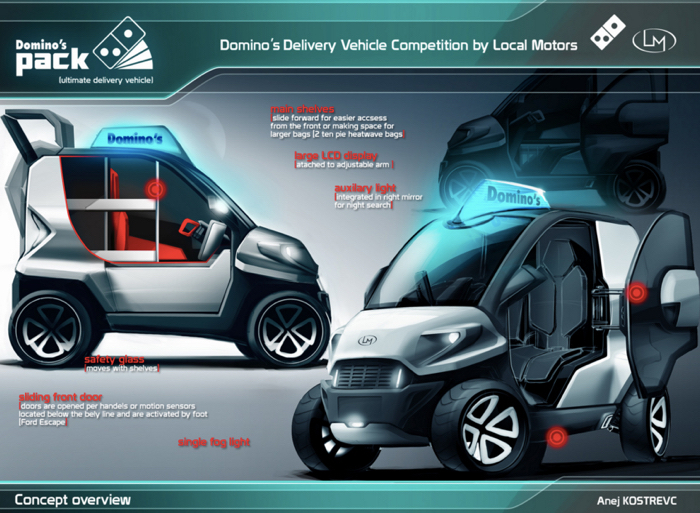 ทีมงานจาก โดมิโน่พิซซ่า (Domino’s pizzas) ได้ร่วมมือกับ บริษัท Local Motor เพื่อเปิดเวทีการประกวดออกแบบรถขนส่งพิซซ่ารูปแบบใหม่ ให้กับลูกค้าในสหรัฐอเมริกา เพราะแต่ก่อนที่ใช้รถของลูกจ้างที่ติดเพียงสติ๊กเกอร์เล็กๆแบรนด์โดมิโน่พิซซ่าเพียงอย่างเดียวนั้นทำให้เมื่อวิ่งบนท้องถนนคนก็ไม่ได้สังเกตเห็น ทำให้หมดโอกาสโปรโมทแบรนด์ของ โดมิโน่พิซซ่า (Domino’s pizzas) ไปในตอนที่รถวิ่งไปเพื่อส่งพิซซ่าทั่วเมือง