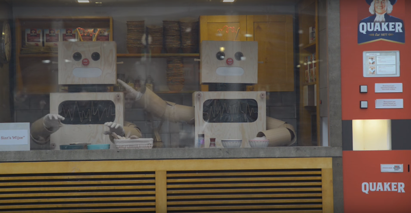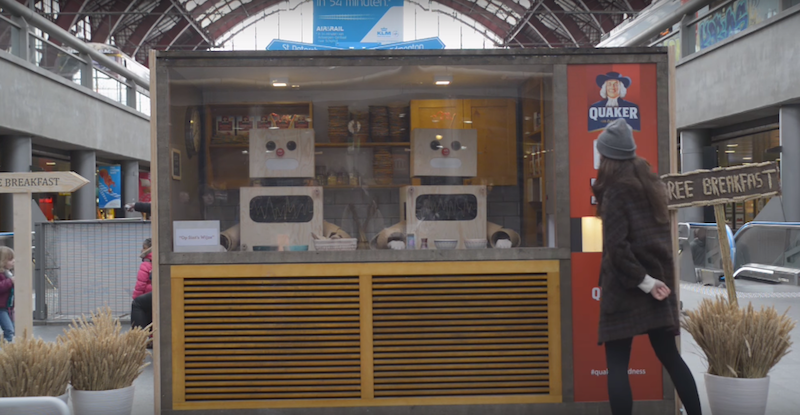 “Quaker” เริ่มที่การจัดตั้งบูธหน้าตาแปลกๆและสะดุดตาเป็นอย่างมาก บนสถานที่ที่ผู้คนต้องไปทุกวันอันได้แก่ สถานีรถไฟ ซึ่งในช่วงเวลาเร่งด่วนที่ทุกคนกำลังหิวเพราะไม่ได้ทานอาหารเช้าออกมาจากบ้าน เมื่อเห็นป้าย Free Breakfast ซึ่งชี้ไปที่บูธที่หน้าตาเหมือน ตู้กดอาหารอัตโนมัติ เราก็จะพุ่งตรงเข้าไปหาในทันที ซึ่งภายในเราก็จะเห็นคนแต่งชุดเป็นหุ่นยนต์สองคนเริ่มทำอาหารเช้าตามคำสั่งที่คุณป้อนเข้าไปให้พวกเขา หลังจากเสิร์ฟอาหารออกไปแล้วจะมีข้อความ See you soon! ปิดท้ายด้วย สร้างความประทับใจให้ผู้ที่ได้พบเห็นและผู้ที่ได้สัมผัสเป็นอย่างมาก