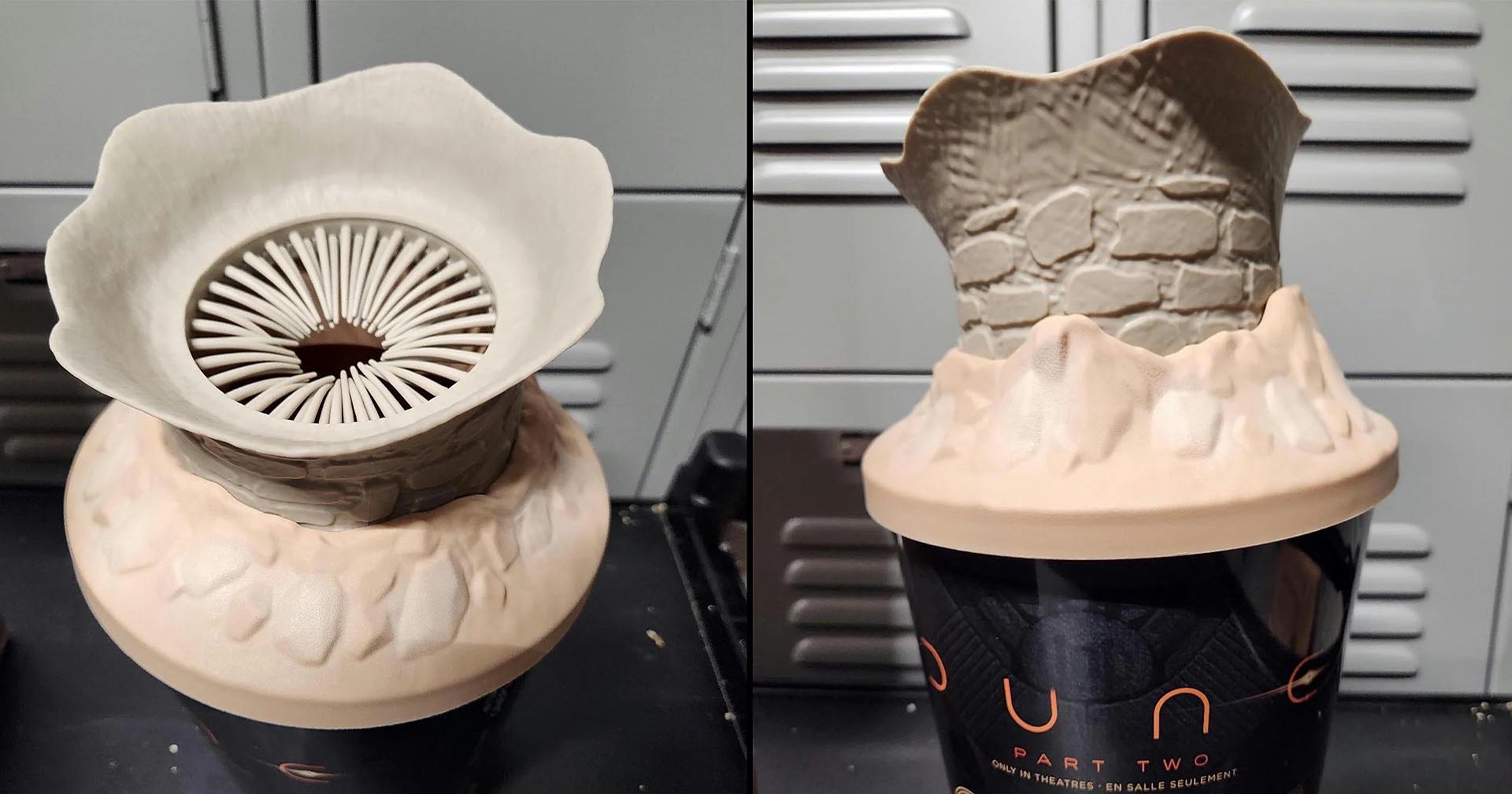 ในการออกแบบถังป๊อปคอร์นหรือแก้วน้ำให้สอดคล้องไปกับหนังแต่ละเรื่องนั้น ส่วนประกอบที่สามารถดีไซน์ได้โลดโผนที่สุดก็เห็นจะเป็นฝาปิด ซึ่งกับหนัง ‘Dune: Part 2’ นั้น ทางผู้ออกแบบก็ดึงตัวหนอนทราย ที่เรียกได้ว่าเป็นเอกลักษณ์หนึ่งของหนัง แบบว่าใครเห็นก็รู้ทันทีว่านี่คือตัวหนอนทราย สิ่งมีชีวิตบนดาวอาร์ราริสมาใส่บนฝาปิดถังป๊อปคอร์น ด้านบนของฝาถัง จะจำลองปากของหนอนทรายเป็นวงกลมแต่มีฟันแหลมยาวอยู่รอบวง เว้นช่องตรงกลางไว้หน่อยเพื่อให้ผู้ชมสามารถล้วงมือลงไปหยิบป๊อปคอร์นได้