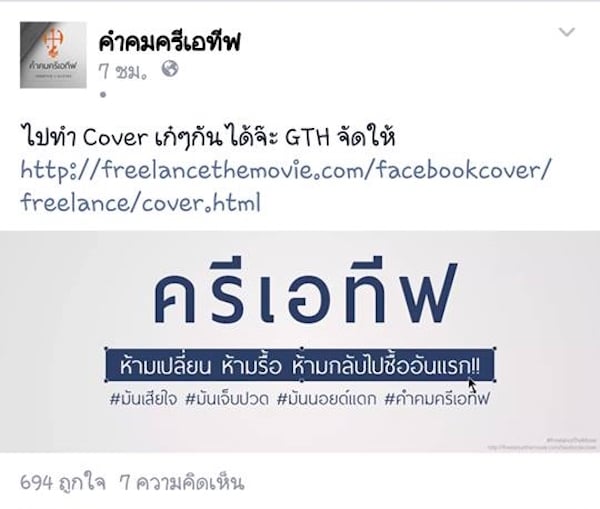 เป็นกระแสฮือฮาอย่างมาก จากภาพยนตร์ “ฟรีแลนซ์ ห้ามป่วย.. ห้ามพัก.. ห้ามรักหมอ” นำแสดงโดย “ซันนี่” และ “ใหม่ ดาวิกา” ภาพยนตร์เรื่องล่าสุดของค่าย GTH จนเกิดเป็นกระแสทำป้ายเลียนแบบภาพยนตร์เรื่องนี้ ไม่เฉพาะแค่ users ที่หันมาทำป้ายเลียนแบบเท่านั้น แต่ยังมีบรรดาแอดมินเพจดังต่างๆมาร่วมเล่นกันเป็นจำนวนมากอีกด้วย รวมถึงเว็บแบไต๋ของเราด้วย อิอิ