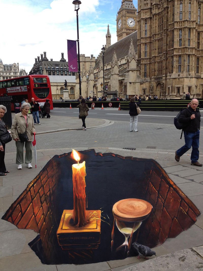 แรงบันดาลใจของเขานั้นเกิดจาก การที่เขาคิดเล่นๆว่า ถ้าเดินๆอยู่แล้วเกิดมีอะไรแปลกมาอยู่บนพื้นถนนจะเป็นยังไง จึงออกมาเป็นผลงานศิลปะสามมิติ ที่เว็บแบไต๋นำภาพมาฝากกันจ้าาา!!