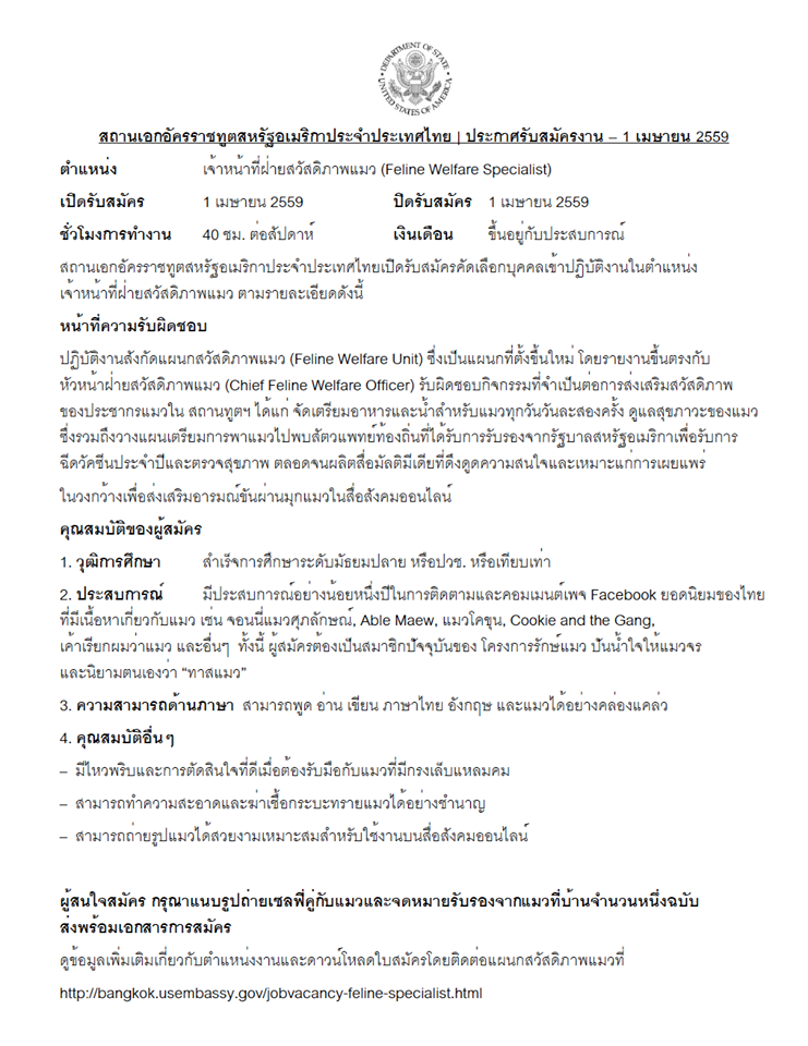 งานนี้ใครกำลังมองหางานที่เหมาะกับตัวเองรีบเลย โดยเฉพาะเหล่าทาสแมว เพราะสถานเอกอัครราชฑูตสหรัฐอเมริกาประจำประเทศไทย ประกาศรับสมัครงานตั้งแต่วันที่ 1 เมษายนนี้ – วันที่ 1 เมษายนนี้เท่านั้น
