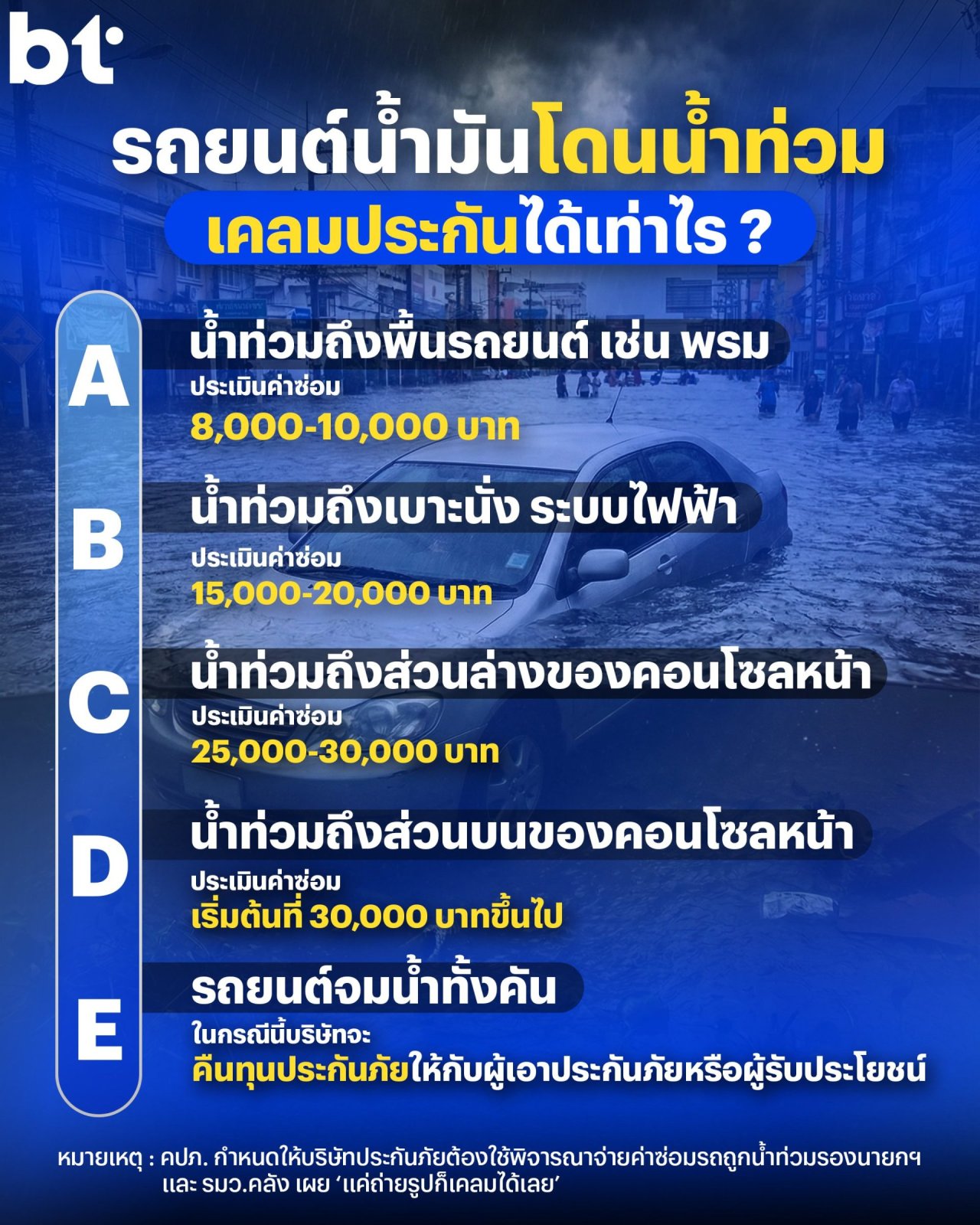 ระดับ E รถยนต์จมน้ำทั้งคัน (Total Loss) บริษัทประกันจะคืนทุนประกันภัยให้แก่ผู้เอาประกันภัย