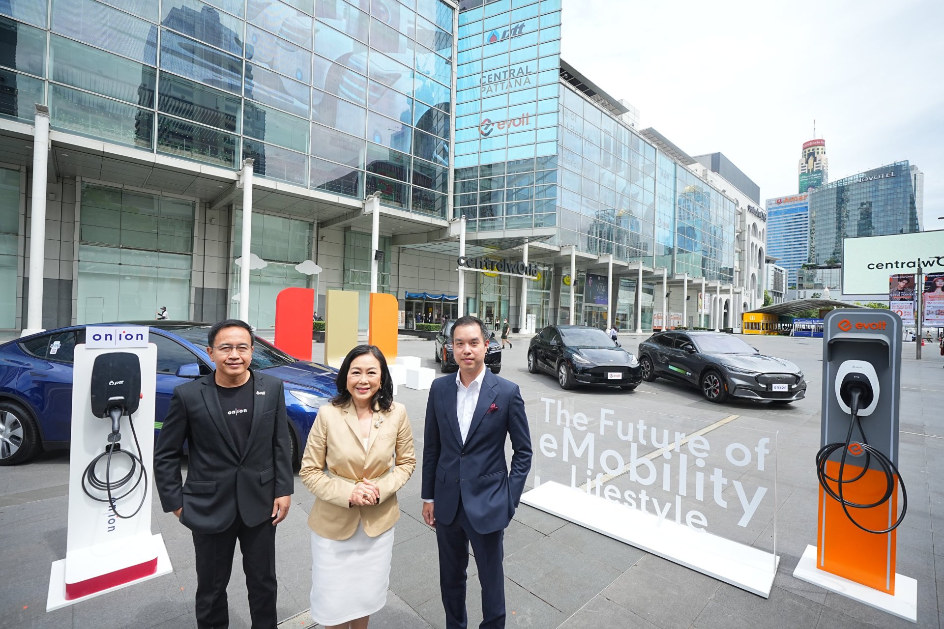 วันที่ 16 สิงหาคม 2565 บริษัท เซ็นทรัลพัฒนา จำกัด (มหาชน) จับมือ กลุ่ม ปตท. ภายใต้แบรนด์ ออน-ไอออน (on-ion) และ บริษัท อีโวลท์ เทคโนโลยี จำกัด แถลงเปิดตัวโครงการ The Future of eMobility Lifestyle อัดงบลงทุนกว่า 200 ล้านบาท ขยายความร่วมมือให้บริการสถานีอัดประจุสำหรับยานยนต์ไฟฟ้าในศูนย์การค้าของเซ็นทรัลพัฒนารวมกว่า 400 ช่องจอด ภายในสิ้นปีนี้