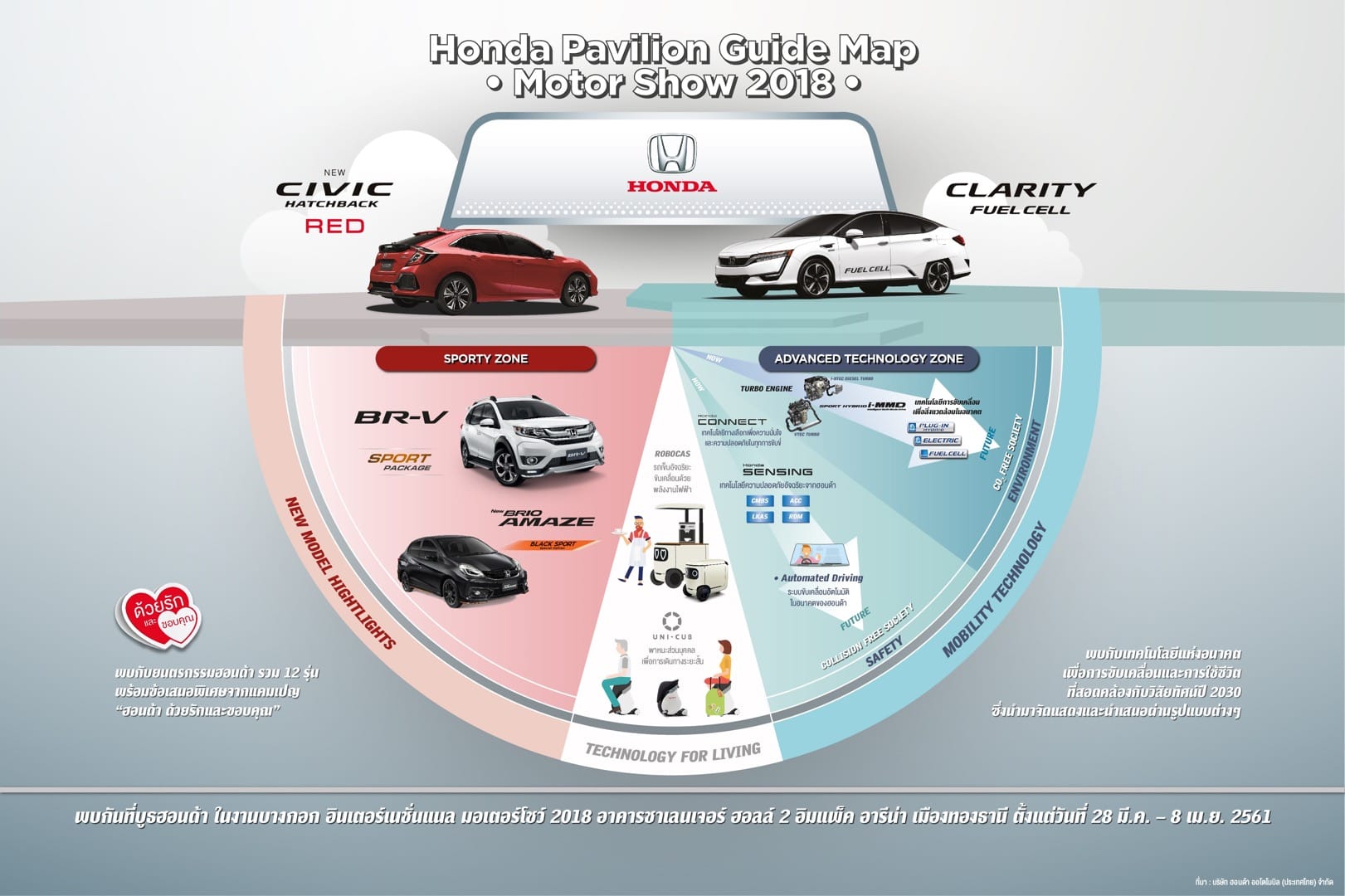 บริษัท ฮอนด้า ออโตโมบิล (ประเทศไทย) จำกัด พร้อมเปิดมุมมองใหม่ ด้วยเทคโนโลยีแห่งอนาคต จัดแสดงที่สุดแห่งเทคโนโลยีเพื่อการขับเคลื่อนและเพิ่มศักยภาพการใช้ชีวิตในโลกอนาคตครั้งแรกในประเทศไทย ในงานบางกอก อินเตอร์เนชั่นแนล มอเตอร์โชว์ 2018 ครั้งที่ 39 พบกับ “ฮอนด้า คลาริตี้ ฟิวเซลล์” ยนตรกรรมพลังงานไฮโดรเจนปราศจากไอเสีย พร้อมอวดรถ “ยูนิ-คับ เบต้า” (UNI-CUB β) พาหนะส่วนบุคคลเพื่อการเคลื่อนที่รอบทิศทางที่พัฒนาต่อยอดจากหุ่นยนต์อัจฉริยะ “อาซิโม” และสัมผัส “ฮอนด้า โรโบแคส” รถเข็นอัจฉริยะที่ขับเคลื่อนด้วยพลังงานไฟฟ้าและสามารถปรับฟังก์ชั่นการใช้งานได้หลากหลายรูปแบบ