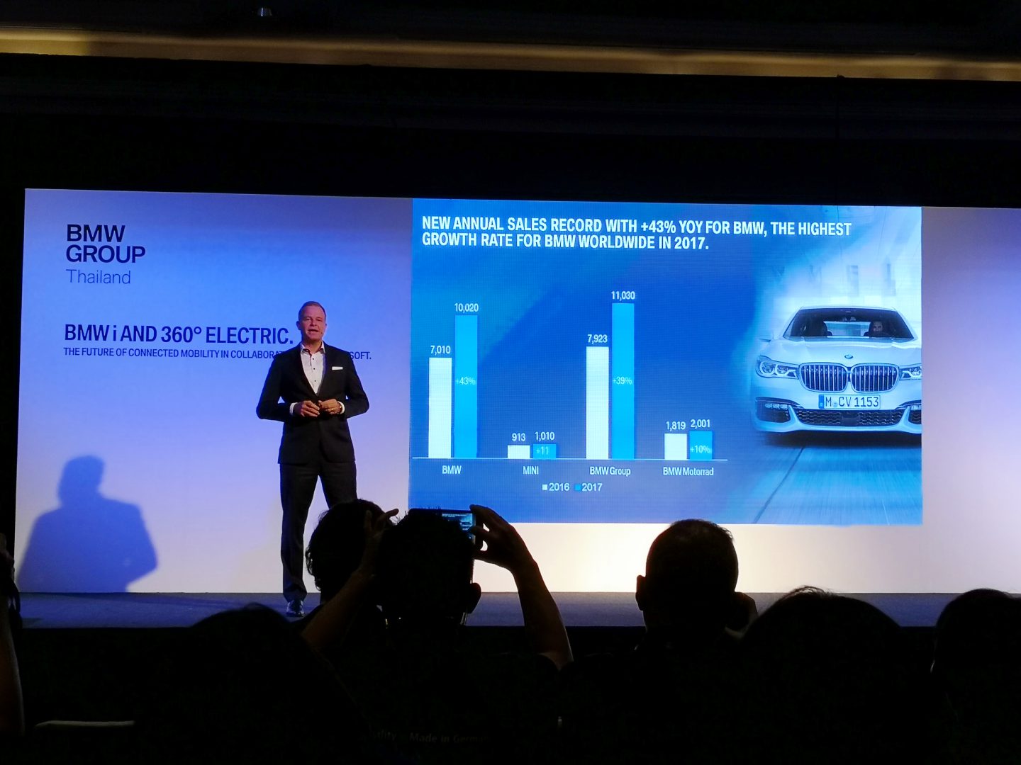 เมื่อปี 2560 ที่ผ่านมา บีเอ็มดับเบิลยู กรุ๊ป ประเทศไทย ได้ประกาศความสำเร็จครั้งประวัติศาสตร์ ด้วยอัตราการเติบโตของรถยนต์ปลั๊กอินไฮบริดที่สูงกว่าปีก่อนหน้ามากถึง 269% และในปีนี้ ตลาดรถยนต์ในเซกเมนต์ปลั๊กอินไฮบริดยังคงมีแนวโน้มการเติบโตที่แข็งแกร่งเช่นกัน ด้วยยอดการส่งมอบที่เพิ่มขึ้นถึง 44% ในช่วงเดือนมกราคมถึงเมษายน 2561 ขณะที่บีเอ็มดับเบิลยู ประเทศไทย ก็ได้สร้างสถิติใหม่ด้วยยอดขายในสี่เดือนแรกของปี ที่สูงเป็นประวัติการณ์กว่า 3,511 คัน หรือเพิ่มขึ้น 20% จากปีที่แล้ว ส่วนบีเอ็มดับเบิลยู มอเตอร์ราด ประเทศไทย ยังสามารถทุบสถิติยอดการส่งมอบรถมอเตอร์ไซค์ที่ 690 คัน คิดเป็นอัตราการเติบโตเพิ่มขึ้นถึง 50% จากช่วงเดียวกันของปี 2560
