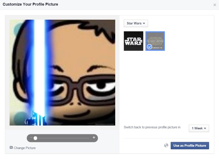กระแสสตาร์วอร์สกำลังมาแรงแซงทุกโค้งทีเดียว โดยเฉพาะอย่างยิ่งสัปดาห์นี้ที่ภาคใหม่ The Force Awakens จะเข้าฉายด้วยแล้ว ล่าสุดเฟซบุคปล่อยฟังก์ชั่นที่ให้ผู้ใช้สามารถเปลี่ยนรูปโปรไฟล์เพื่อแสดงถึงความเป็นแฟนตัวจริงของหนังสงครามอวกาศเรื่องนี้กันได้เล้ว