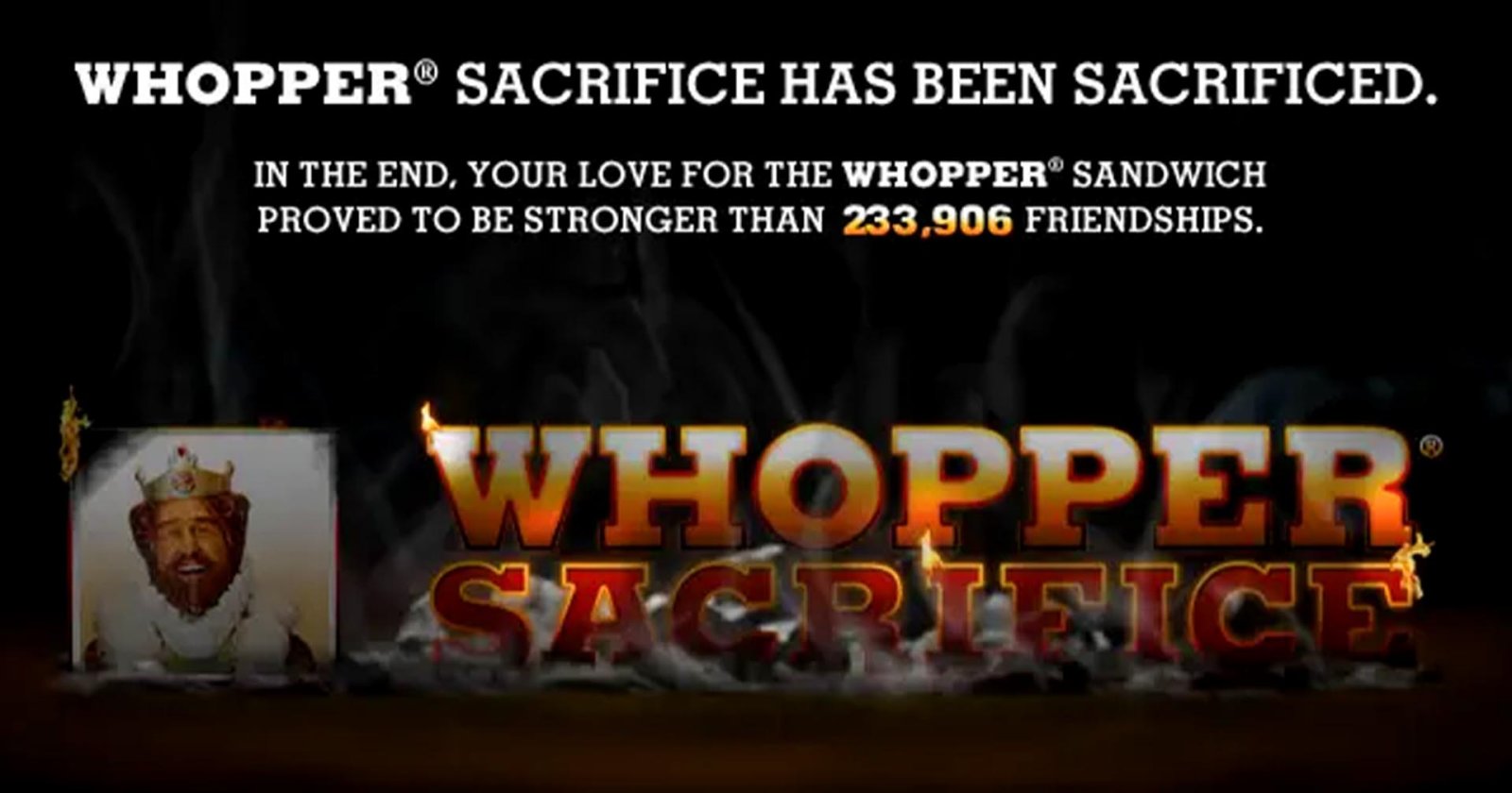เราเคยเห็นแต่แบรนด์ดัง ๆ ออกแคมเปญสร้างความรักในหมู่เพื่อน เช่น ชักชวนเพื่อน 10 คนมาด้วยกันแล้วจะได้ส่วนลดกี่เปอร์เซ็นต์ อะไรประมาณนี้ แต่เมื่อปี 2009 Burger King แฟรนไชส์ฟาสต์ฟู้ดเบอร์ต้น ๆ ของโลก กลับออกแคมเปญที่ฉีกรูปแบบเดิม ๆ ที่ไม่เคยมีใครทำมาก่อน ด้วยแคมเปญที่มีชื่อว่า 'Whopper Sacrifice' วิธีการร่วมแคมเปญนี้ง่ายมากเลย นั่นก็คือ อันเฟรนด์เพื่อนบนเฟซบุ๊ก 10 คน แล้วมารับวอปเปอร์มูลค่าประมาณ 5 เหรียญ ไปฟรี ๆ เลย 1 ชิ้นสุชยา เกษจำรัส | 1064 days ago