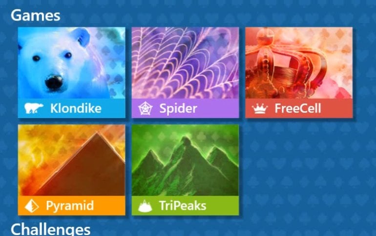 หน้าแรกของ Solitaire Collection บน Windows 10 จะดูจากบนลงล่าง
