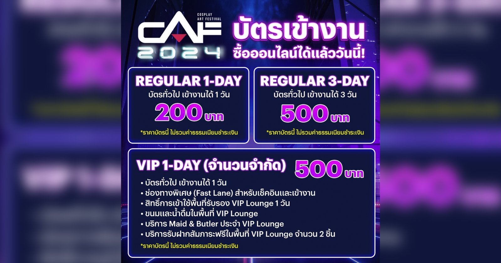เหลือเวลาอีกไม่มากแล้วสำหรับงาน CAF 2024 มหกรรมคอสเพลย์ครั้งใหญ่ที่จัดต่อเนื่องเป็นปีที่ 2 ซึ่งปีนี้กลับมาจัดในสถานที่ใหม่ TRUE ICON HALL ที่ ICON SIAM โดยบัตรเข้างานมีราคาดังนี้