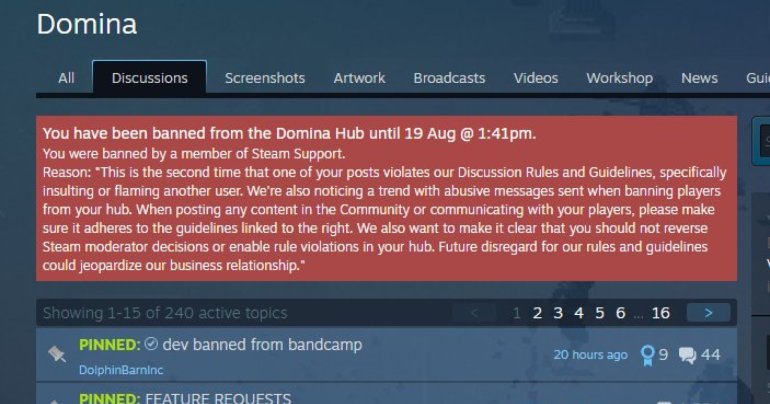 นักพัฒนาเกมจาก Dolphin Barn Incorporated ถูกแบนจากกระดานสนทนาของเกม Domina ที่ทางค่ายพัฒนาขึ้นเองบน Steam หลังละเมิดกฎจากที่ไปหยาบคายใส่แฟนเกมบนกระดานสนทนาแห่งนี้