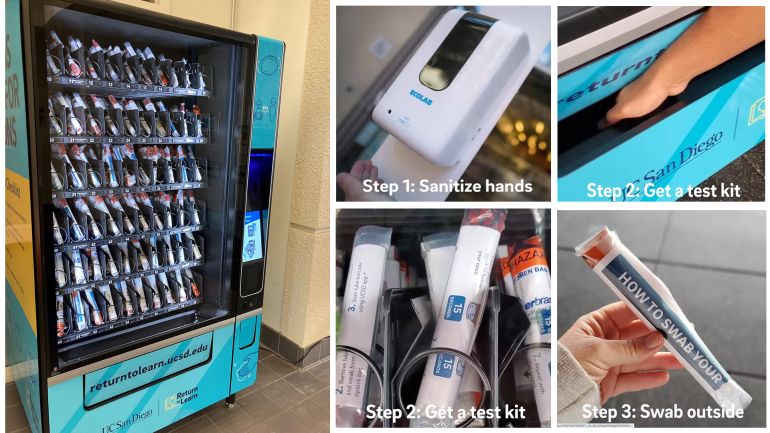 มหาวิทยาลัยแคลิฟอร์เนียซานดิเอโก (UCSD) ได้ออกมาตรการรับมือการแพร่ระบาดของ COVID-19 ในช่วงสัปดาห์นี้ที่เหล่านักศึกษาของสหรัฐฯ จะต้องกลับเข้าเรียนในรั้วมหาวิทยาลัย โดยให้บริการชุดทดสอบ COVID-19 ผ่านเครื่องจำหน่ายสินค้าอัตโนมัติที่ติดตั้งอยู่รอบมหาวิทยาลัย 20 เครื่องได้ฟรีด้วยตนเอง เพื่อต้องการทดสอบตรวจหาผู้ติดเชื้อและควบคุมการแพร่ระบาดโดยแยกที่พักให้กับผู้ติดเชื้อ