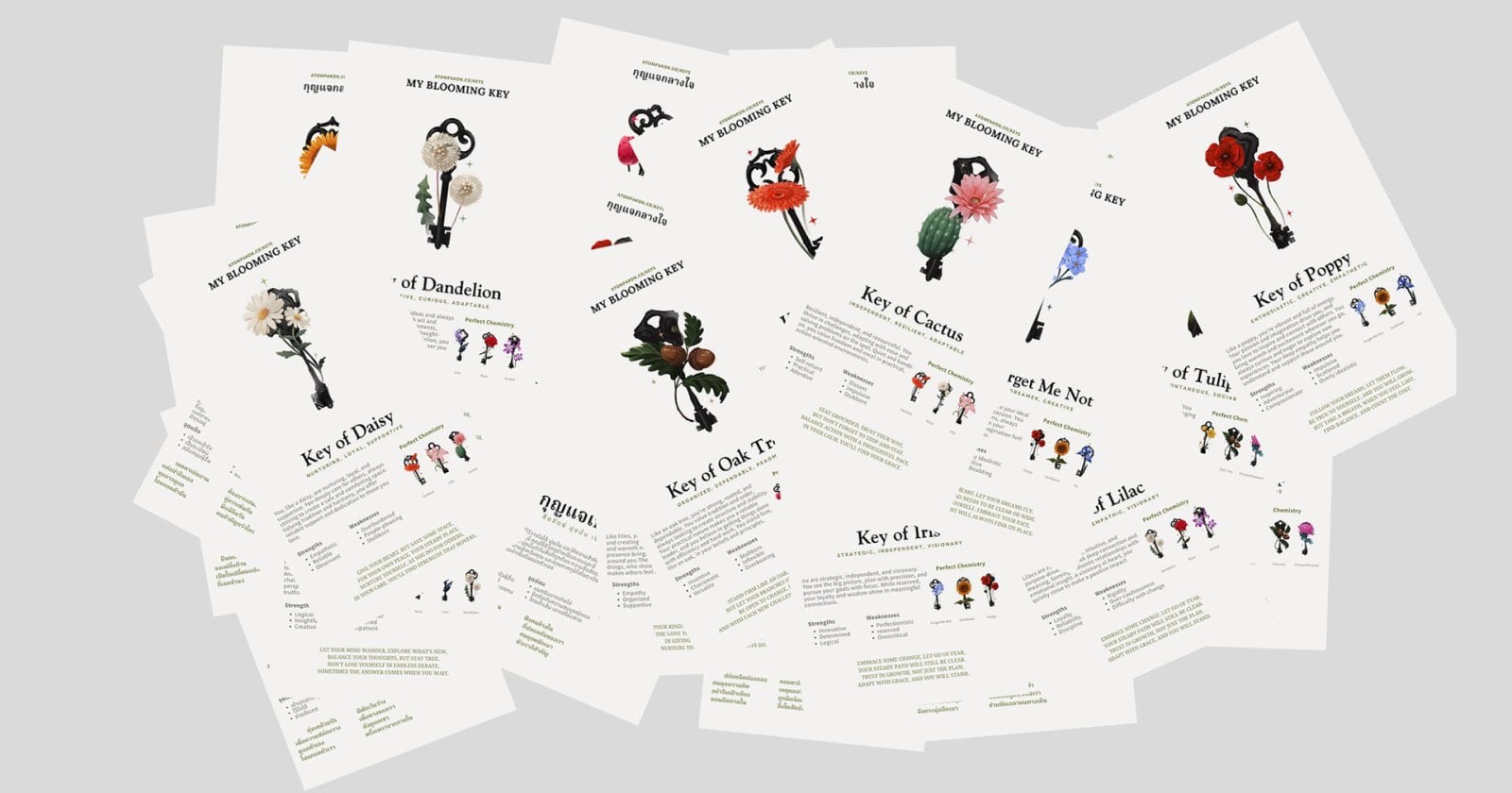 ในช่วง 2 - 3 วันที่ผ่านมา เชื่อว่าโซเชียลและสตอรี่ของใครหลาย ๆ คนน่าจะมีแต่ดอกไม้เต็มไปหมด วันนี้แอดหาข้อมูลมาให้แล้ว ทุกคนน่าจะเคยได้ยินกันผ่าน ๆ มาบ้างใช่มั้ยคะ กับคำว่าดอกไม้ในใจเบ่งบาน แต่รู้มั้ยคะว่าประโยคนี้จะขึ้นอยู่กับสภาพจิตใจของเราที่กำลังเจอเหตุการณ์ใด ๆ อยู่ ดอกไม้ในใจจะเบ่งบานหรือไม่ก็เป็นเรื่องของแต่ละคนอีก แต่แบบทดสอบนี้เป็นเหมือนกับ ‘กุญแจ’ ที่จะไขเพื่อบอกว่าดอกไม้ในใจที่จะแทนตัวตนของเราคืออะไร สภาพจิตใจเราเป็นยังไงบ้างนะตอนนี้ เหมือนให้เราทบทวนกับตัวเอง โดยเสียเวลาสักแค่ 5 นาทีดู กุญแจกลางใจ คืออะไร ? My Blooming Key หรือ กุญแจกลางใจ เป็นแบบทดสอบสั้น ๆ เชิงจิตวิทยา เป็นแบบทดสอบที่คุณ “Atompakon” หรือ อะตอม ปกรณ์ แก้วดี คอนเทนต์ครีเอเตอร์สายอาร์ต ได้คิดค้นขึ้นมาด้วยตัวเอง ตั้งแต่ขั้นตอนของการคิดคำถาม การวาดดอกไม้ต่าง ๆ ดนตรี รวมไปถึงเลือกใช้ภาษาที่สละสลวยในการดำเนินแบบทดสอบ ซึ่งตอนแรกที่เปิดตัวแบบทดสอบยังมีเพียงภาษาอังกฤษ และไม่มีเพลงประกอบระหว่างทำ แต่กระแสตอบรับดีทะลุปรอท คนเข้าไปเว็บไซต์จนเกือบจะเต็มจำนวนโควตา และได้มีการเรียกร้องให้ทำเวอร์ชันภาษาไทยออกมาด้วย ปัจจุบันทุกคนก็สามารถเข้าไปเล่นได้…