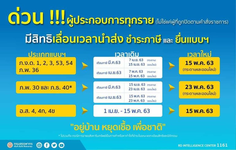 นายอุตตม สาวนายน รัฐมนตรีว่าการกระทรวงการคลัง เปิดเผยว่าทางกระทรวงการคลังอนุมัติขยายเวลากำหนดการยื่นแบบแสดงรายการและการชำระภาษีอากรตามประมวลรัษฎากรออกไปให้ครอบคลุมผู้ประกอบการเป็นการทั่วไปซึ่งเป็นการเพิ่มเติมผู้ที่ได้รับสิทธิ์ดังกล่าว จากประกาศกระทรวงการคลังเมื่อวันที่ 31 มีนาคม 2563 เพื่อช่วยเหลือผู้ประกอบการส่วนใหญ่ที่ได้รับผลกระทบ จากการแพร่ระบาดของโรคติดเชื้อไวรัส COVID-19 ทั้งทางตรงและทางอ้อม อาทิ ผู้บริหารหรือพนักงานที่เกี่ยวข้องการยื่นแบบภาษีต้องถูกกักตัวจาก COVID-19 จนไม่สามารถทำงานได้ หรือสำนักงานบัญชีที่ไม่สามารถเข้าไปในสถานที่ประกอบการเพื่อเตรียมทำบัญชีและภาษี หรือสถานประกอบการที่อยู่ในห่วงโซ่อุปทานเดียวกันกับสถานประกอบการที่ถูกปิดกิจการ อีกทั้งยังเป็นการดำเนินการที่สอดคล้องกับนโยบายของรัฐบาลที่รณรงค์ให้ประชาชนอยู่บ้าน และให้ผู้ประกอบการพิจารณาให้ลูกจ้างทำงานที่บ้าน เพื่อลดความเสี่ยงจากการแพร่ระบาดจาก COVID-19 นายเอกนิติ นิติทัณฑ์ประภาศ อธิบดีกรมสรรพากร กล่าวเพิ่มเติมว่า การขยายกำหนดเวลาการยื่นแบบแสดงรายการชำระภาษีอากรในครั้งนี้ มีรายละเอียดดังต่อไปนี้ ภาษีเงินได้หัก ณ ที่จ่าย (แบบ ภ.ง.ด. 1 แบบ ภ.ง.ด 2 แบบ ภ.ง.ด 3 แบบ ภ.ง.ด 53 และแบบ ภ.ง.ด 54) ของเดือนมีนาคมและเดือนเมษายน 2563 ที่ต้องยื่นและชำระภาษีภายในเดือนเมษายนและเดือนพฤษภาคม 2563 ตามลำดับ ขยายออกไปถึงวันที่ 15 พฤษภาคม 2563…