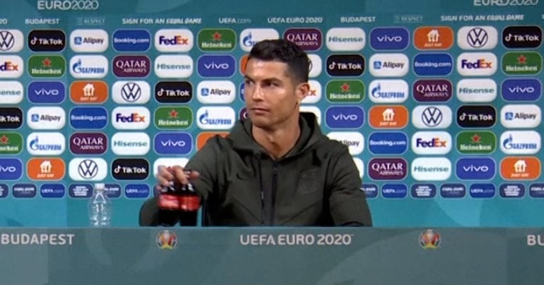 ประเด็นดังจากวงการกีฬา ที่ถูกพูดถึงหนาหูในช่วง 2-3 วันที่ผ่านมานั้น คงหนีไม่พ้นการแข่งขันฟุตบอลยูโร ที่ดูแล้วตัวนักเตะจะกลายเป็นที่สนใจมากกว่าเกมในสนาม จากกรณีที่นักเตะนำเครื่องดื่มของสปอนเซอร์ออกไปจากโต๊ะแถลงข่าว นับว่ากลายเป็นเทรนด์ไปแล้วสำหรับฟุตบอลยูโร 2020 ในปีนี้ ที่เหล่านักเตะชื่อดังต่างนำเครื่องดื่มของสปอนเซอร์ออกจากโต๊ะสัมภาษณ์ ด้วยเหตุผลที่แตกต่างกันออกไป จนเหล่าผู้จัดและสปอนเซอร์ต่างได้รับผลกระทบไปตามๆ กัน ฟุตบอลยูโร 2020 ที่เลื่อนออกมาจัดในปี 2021 จากการแพร่ระบาดของโรคโควิด-19 นั้น มีเรื่องให้พูดถึงกันอย่างกว้างขวางไปทั่วโลก หลังจากที่คริสเตียโน โรนัลโด (Cristiano Ronaldo) นักเตะชื่อดังชาวโปรตุเกสได้นำขวดน้ำอัดลมจำนวน 2 ขวดออกจากโต๊ะแถลงข่าวและนำน้ำเปล่ามาวางแทน พร้อมแนะนำให้ทุกคนดื่มเปล่าแทนน้ำอัดลม ซึ่งการกระทำดังกล่าวส่งผลมหาศาลต่อแบรนด์น้ำอัดลมแบรนด์นี้ที่เป็นสปอนเซอร์หลักของการแข่งขันยูโร 2020 เพราะทำเอาหุ้นของบริษัทน้ำอัดลมดิ่งลง 1.6% แทบทันจะทันที อยู่ที่ 55.22 เหรียญสหรัฐฯ หรือ 1,735 บาท ทำให้สูญเสียมูลค่าทางตลาดไปถึง 4,000 ล้านเหรียญสหรัฐฯ หรือกว่า 124,000 ล้านบาทเลยทีเดียว คนต่อมา มีปอล ป็อกบา (Paul Pogba) นักเตะทีมชาติฝรั่งเศสที่นำเครื่องดื่มแอลกอฮอล์ออกจากโต๊ะแถลงข่าวเช่นกัน โดยให้เหตุผลว่าเขาเป็นชาวมุสลิมที่เคร่งศาสนา ซึ่งมีกฎห้ามดื่มของมึนเมา ถึงแม้ทางแบรนด์โฆษณาจะพยายามโปรโมตแล้วก็ตามว่าเบียร์ของพวกเขาเป็นเบียร์ที่มีแอลกอฮอล์…