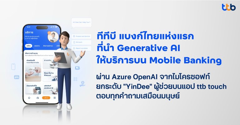 ธนาคารทีเอ็มบีธนชาต หรือ ทีทีบี เปิดตัว "ยินดี-Yindee" ผู้ช่วยอัจฉริยะบนแอปพลิเคชัน ttb touch เวอร์ชันใหม่ที่ใช้เทคโนโลยี Generative AI ผ่าน Microsoft Azure OpenAI เป็นรายแรกของประเทศ มุ่งยกระดับประสบการณ์ทางการเงินของลูกค้าด้วยปัญญาประดิษฐ์ที่เป็นเหมือนผู้ช่วยส่วนตัวของผู้ใช้เอกพล ชูเชิด | 391 days ago