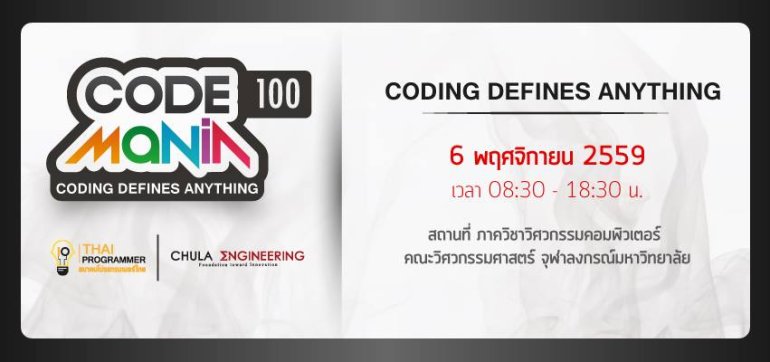 กลับมาอีกครั้งแล้วครับกับงานใหญ่ประจำปีของสมาคมโปรแกรมเมอร์ไทย Code Mania 100 (ยังคงจัดตามปกติ ขอให้แต่งกายให้สุภาพนะครับ)