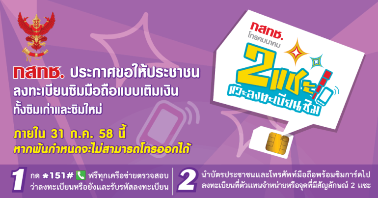 เราน่าจะพอทราบข่าวกันมาบ้างนะครับว่า กสทช. ประกาศให้ผู้ใช้โทรศัพท์เคลื่อนที่ทุกหมายเลข โดยเฉพาะผู้ใช้ในระบบเติมเงินหรือ Pre-paid ต้องลงทะเบียนซิมภายในวันที่ 31 กรกฎาคมนี้เท่านั้น ไม่เช่นนั้นจะถูกงดให้บริการจากเครือข่าย เราจึงสรุปให้ฟังกันอีกทีว่า ทำไมต้องลงทะเบียนซิม ลงทะเบียนอย่างไร ถ้าไม่ลงทะเบียนแล้วจะเสียสิทธิ์อะไรบ้าง