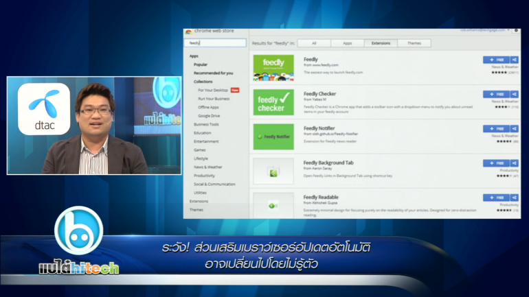 http://youtu.be/zoHT1glPKJs ปรกติแล้ว extension หรือ “ส่วนเสริม” ของ browser ต่าง ๆ จะถูก load จาก store ของ browser นั้น ๆ โดยตรง ทำให้เราค่อนข้างมั่นใจได้ว่า ปลอดภัย ทั้งนี้เพราะว่า store เหล่านี้ มีการตรวจสอบความปลอดภัย และความไว้ใจได้อยู่ในระดับหนึ่ง