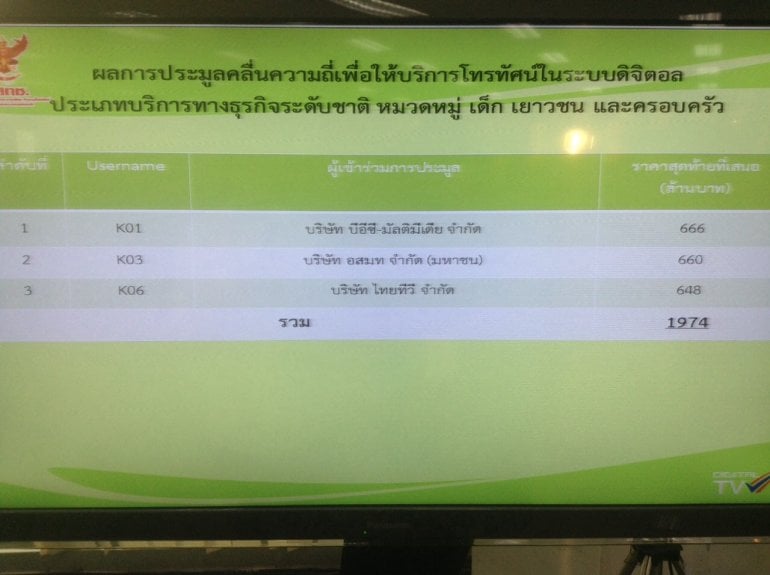 เราได้ทำการสรุปผลการประมูลทีวีดิจิตอลของวันที่ 26 และ 27 ธันวาคม 2556 ณ อาคาร CAT Tower ไว้แล้ว ณ ที่นี้