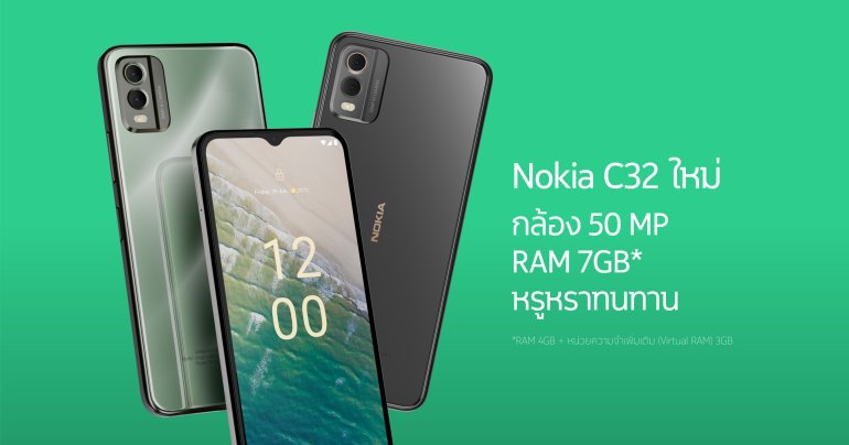 เอชเอ็มดี โกลบอล ประเทศไทย พร้อมวางจำหน่าย Nokia C32 สมาร์ตโฟนตระกูล C ซีรีส์ หลังเปิดตัวอย่างเป็นทางการในงาน Mobile World Congress (MWC 2023) เมื่อเดือนมีนาคม 2566 ที่ผ่านมา ปลื้มผลตอบรับในงานดี ชูจุดเด่นราคาสุดคุ้ม ในงบเพียง 3,590 บาท ให้ความเร็วแรงด้วย RAM 7GB* (RAM4GB+หน่วยความจำเพิ่มเติม (Virtual RAM) 3GB) พร้อมกล้องหลังความละเอียด 50MP และ Macro ความละเอียด 2MP กล้องหน้าความละเอียด 8MP เก็บทุกโมเม้นภาพสวยคมชัดแม้ที่แสงน้อย สัมผัสหน้าจอ IPS-LCD ขนาด 6.5 นิ้ว ความละเอียดคมชัด 1600 x 720 พิกเซล ตัวเครื่องด้านหลังเป็นกระจก ดีไซน์ หรูหรา พรีเมียมเกินราคา สนองการใช้งานราบรื่น ตอบโจทย์ทุกไลฟ์สไตล์การถ่ายภาพอย่างลงตัว…