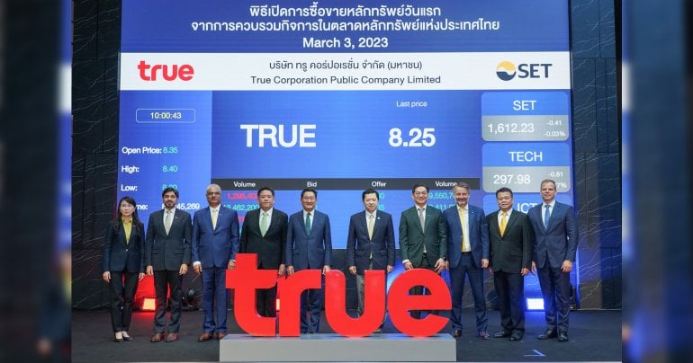 บริษัท ทรู คอร์ปอเรชั่น จำกัด (มหาชน) ใช้ชื่อย่อในตลาดหลักทรัพย์ว่า TRUE เข้าซื้อขายหุ้น (เทรด) วันแรกจากการควบรวมกิจการในตลาดหลักทรัพย์แห่งประเทศไทย (SET)