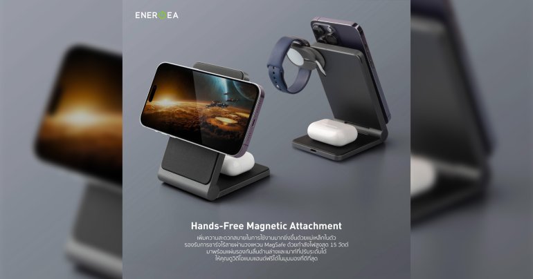 บริษัท อาร์ทีบี เทคโนโลยี จำกัด ผู้นำเข้าและจัดจำหน่ายสินค้าแก็ดเจ็ตรายใหญ่ในประเทศไทย และเป็นตัวแทนจำหน่ายอุปกรณ์เสริมด้านพาวเวอร์โซลูชั่นระดับพรีเมียมภายใต้แบรนด์ “Energea” (เอ็นเนอร์เจีย) ส่งแท่นชาร์จแม่เหล็ก(MagClick)ไร้สายรุ่นใหม่ล่าสุด “MAGTRIO” เอาใจสาวก Apple ให้ใช้งานได้อย่างสะดวกสบายยิ่งขึ้น โดย MAGTRIO เป็นแท่นชาร์จแม่เหล็กไร้สายแบบ 3-in-1 ที่มาพร้อมพลังการชาร์จแบบมัลติฟังก์ชั่น ทำให้สามารถชาร์จอุปกรณ์ได้อย่างรวดเร็วถึง 3 อุปกรณ์พร้อมกัน ทั้ง iPhone, AirPods และ Apple Watch
