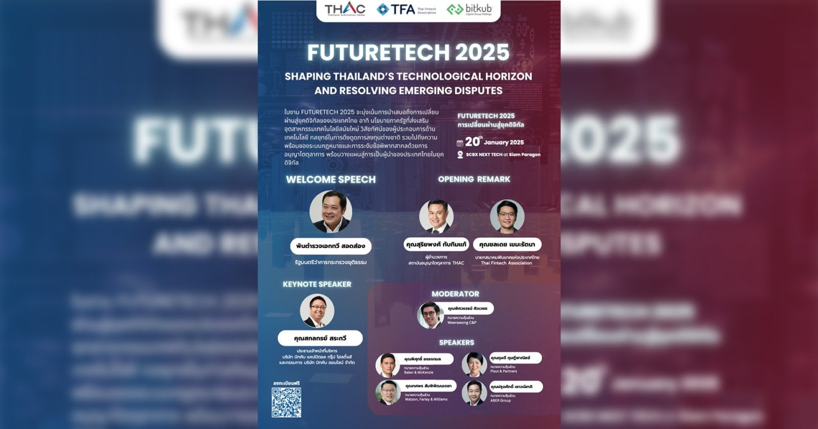 งาน Future Tech 2025 เป็นอีกหนึ่งเวทีสำคัญที่มุ่งเน้นสร้างความเข้าใจและส่งเสริมความก้าวหน้าทางเทคโนโลยี รวมถึงการจัดการข้อพิพาทในธุรกิจฟินเทค (FinTech) ที่กำลังเติบโตอย่างรวดเร็วในยุคดิจิทัล โดย Thailand Arbitration Center (THAC) ได้จัดกิจกรรมนี้เพื่อสร้างเวทีแลกเปลี่ยนความรู้และแนวทางปฏิบัติที่เป็นประโยชน์สำหรับผู้ประกอบการและผู้เชี่ยวชาญในอุตสาหกรรม