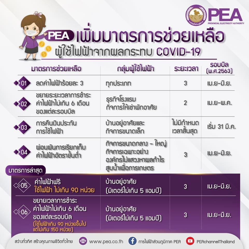 และอีกมาตรการคือ การเรียกเก็บเงินอัตรา minimum charge ในกรณีที่ปิดกิจการชั่วคราวก็จะไม่ต้องเสียเงินภายใน 3 เดือนนี้ โดยมีผู้ได้สิทธิ์ประมาณ 30,000 ราย รวมมูลค่าประมาณ 167 ล้านบาท และส่วนใครที่ใช้ไฟน้อย ต่ำกว่า 90 หน่วย ไม่ต้องเสียเงินเลย 3 เดือนติดต่อกันเฉพาะผู้ที่มีมิเตอร์ 5(15 A) แต่ถ้าใครใช้ไฟเกิน ก็ยืดหยุ่นให้ผลัดชำระไปอีก 6 เดือน 3 รอบบิล