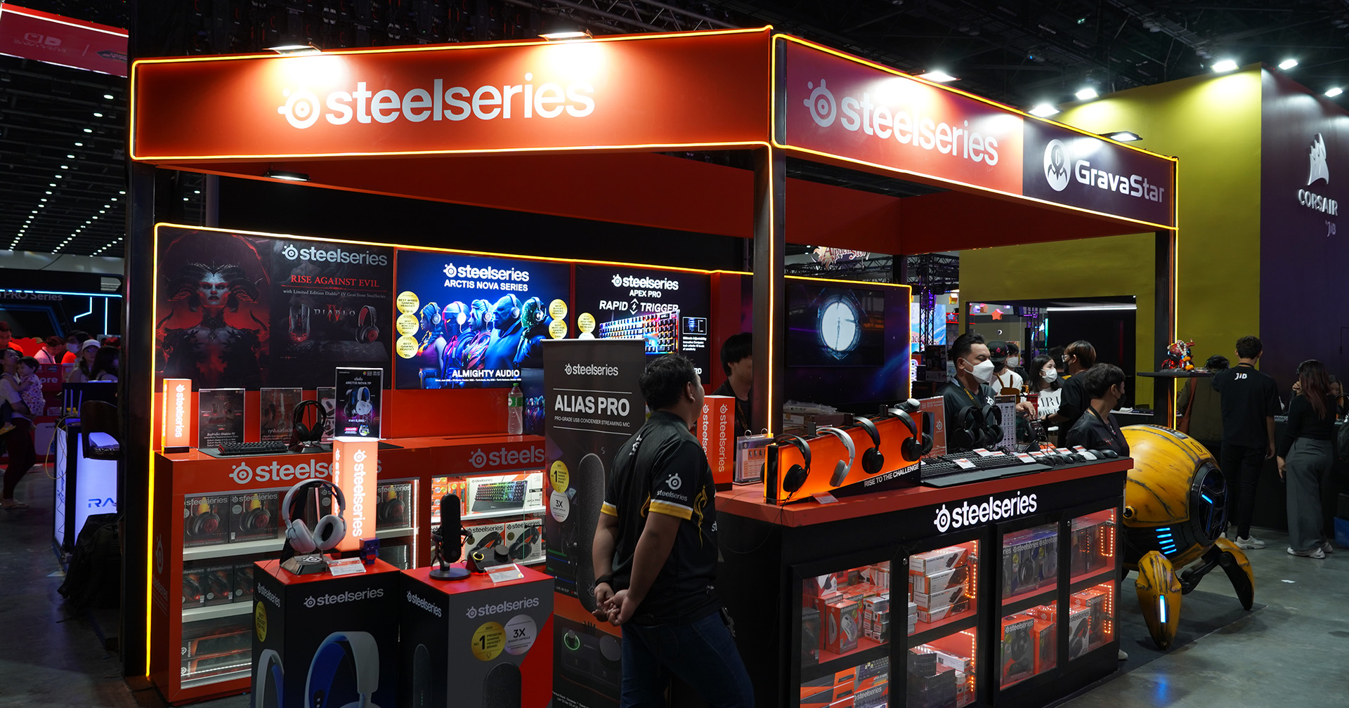 โดยในบูธได้มีการวางจำหน่ายสินค้า Gaming Gear จากแบรนด์ Steelseries ต่าง ๆ มากมาย แต่สินค้าที่เป็นไฮไลท์จะประกอบไปด้วย Steelseries Alias – ไมค์โครโฟนคอนเดนเซอร์ USB-C, หูฟังเกมมิงไร้สาย Steelseries Arctis Nova 7P และคอลเล็กชันเกมมิงเกียร์ที่คอลแลบกับ Diablo IV เกมแอ็กชัน RPG ใหม่จากค่าย Blizzard ให้ได้ลองกัน