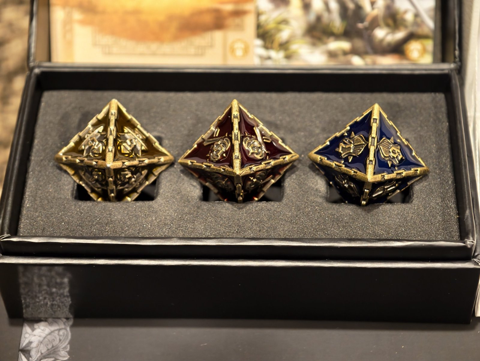 ลูกเต๋า 8 หน้า 3 ลูก ที่ทำสีพิเศษสัญลักษณ์ของ Wealth (มั่งคั่ง), Power (พลัง) และ Fame (ชื่อเสียง) อุปกรณ์ประกอบการเล่นสำหรับสายบอร์ดเกม วัสดุทำจากเรซินคุณภาพสูง แข็งแรงและมีน้ำหนักมือที่ดีมาก
