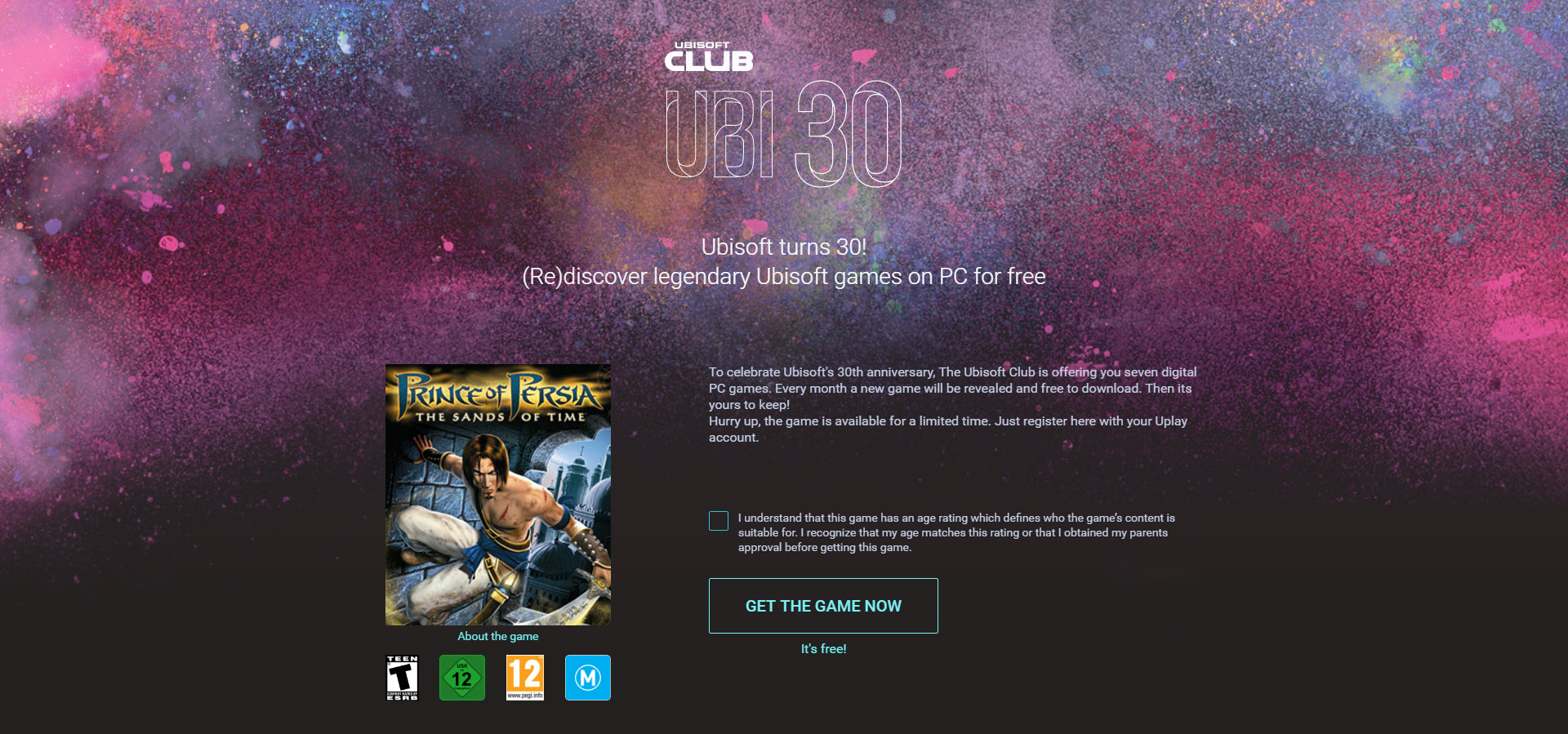 ในการเข้าไปรับเกมฟรีนั้นก็ง่ายนิดเดียว เพียงแค่ไปที่ลิงก์กิจกรรม https://club.ubi.com/#!/en-US/ubi30 จากนั้นล็อคอินบัญชี Uplay และยอมรับข้อตกลงของกิจกรรมเสียก่อน ก่อนที่จะกด GET THE GAME NOW