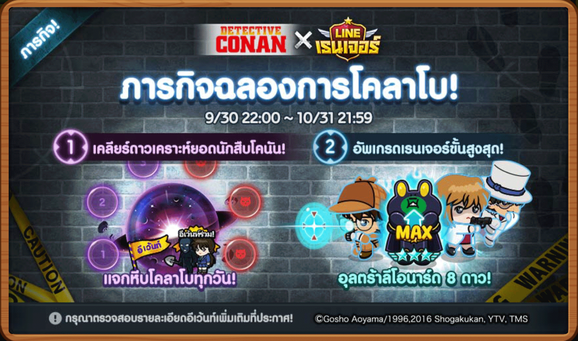 นอกจากนี้ยังมีภารกิจฉลองการโคลาโบ โดยให้เราเคลียร์ดาวเคราะห์ยอดนักสืบโคนัน และสามารถอัพเกรดเรนเจอร์ขั้นสูงสุดกับ อัลตร้าลีโอนาร์ด 8 ดาวอีกด้วย