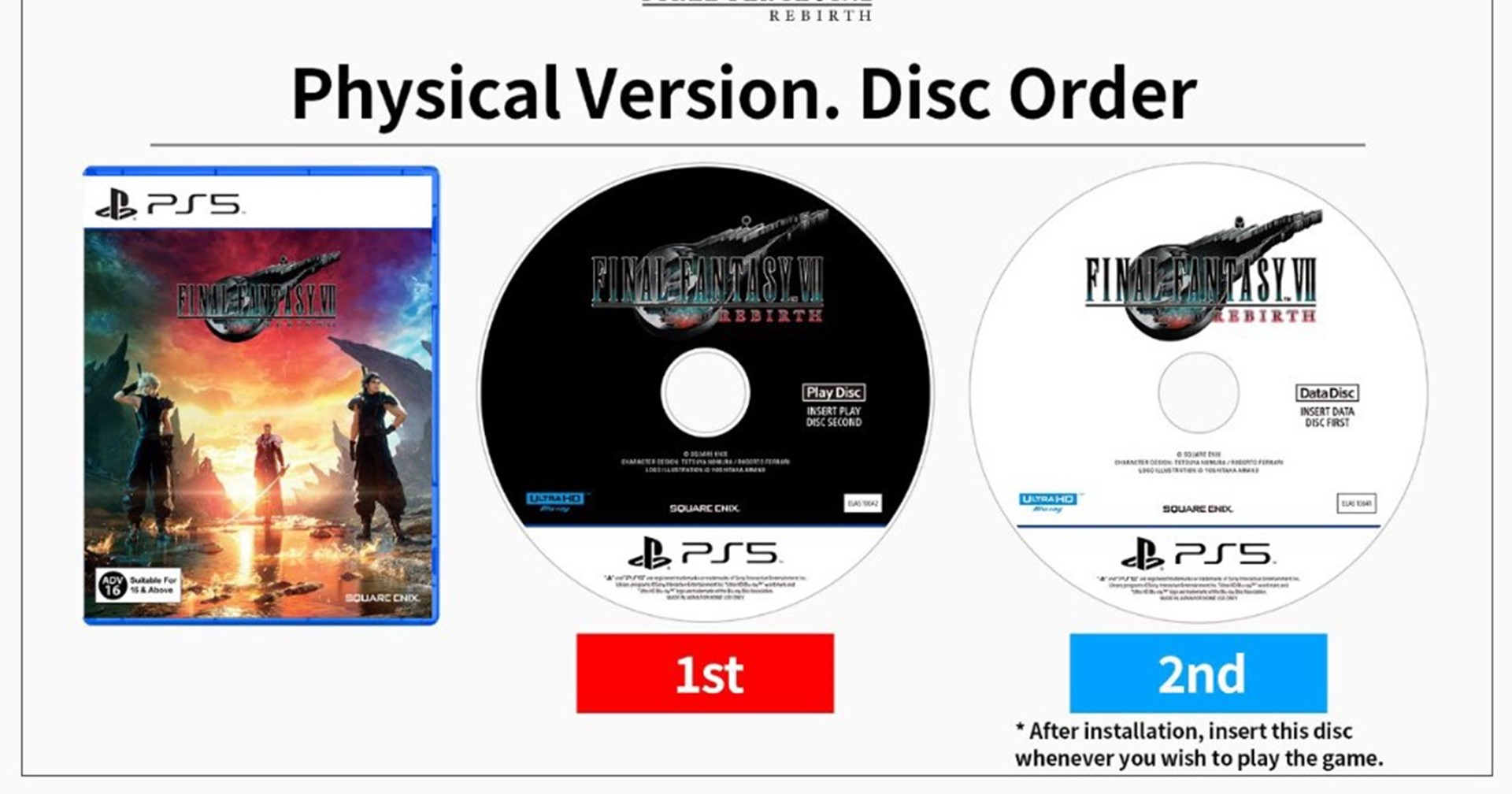 ซึ่งทาง Square Enix ได้ประกาศว่าให้ผู้เล่นใส่แผ่นสีดำที่เขียนว่า “Play Disc” ลงในคอนโซล PlayStation 5 ก่อนเพื่อติดตั้งข้อมูลที่จำเป็น และหลังจากทำตามคำแนะนำบนหน้าจอแล้ว เมื่อติดตั้งเสร็จสิ้นก็ให้ใส่แผ่นสีขาวที่เขียนว่า “Data Disc” เพื่อเข้าสู่เกมและเล่นได้ตามปรกติ