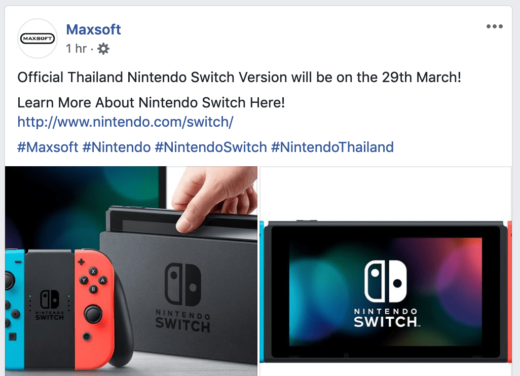 ต้องบอกก่อนเลยว่านี่ไม่ใช่แค่ข่าวลือแต่อย่างใด เพราะว่าวันนี้ บริษัท Maxsoft Online ได้ออกมาประกาศผ่านหน้า Facebook Fanpage ของตัวเองว่า “Official Thailand Nintendo Switch Version กำลังจะมาในวันที่ 29 มีนาคม !!”