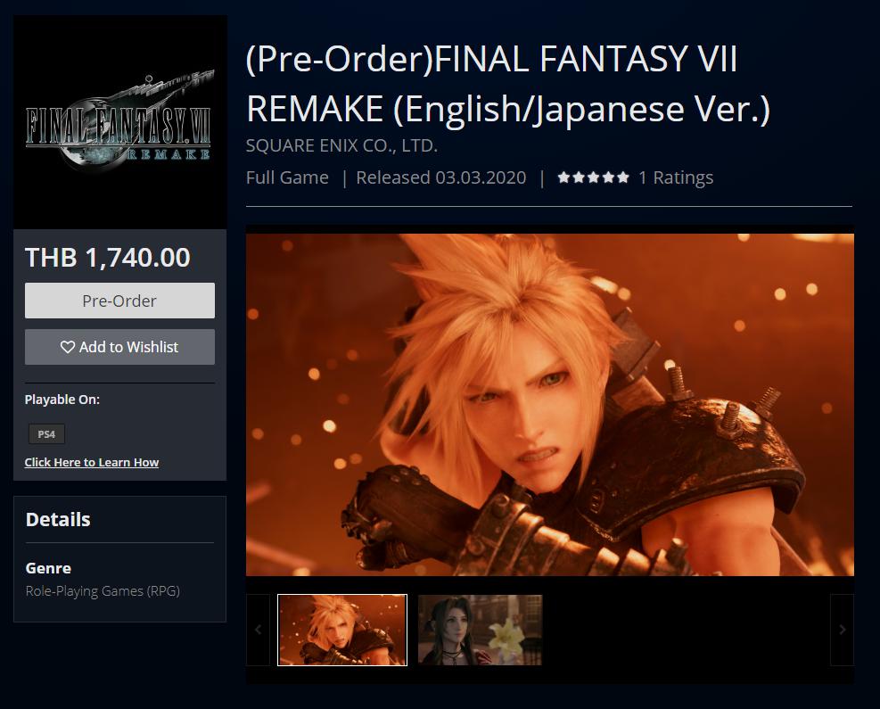 ค่ายเกมชื่อดัง SQUARE ENIX ประกาศวันวางจำหน่ายสุดยอดเกมในตำนานที่นำกลับมาสร้างใหม่ อย่าง FINAL FANTASY® VII REMAKE ในวันที่ 3 มีนาคม ปี 2020 สำหรับการเล่นในระบบของ PlayStation®4 เปิดรอบ Pre-Order ผ่านระบบดิจิทัลแล้ววันนี้ที่ PS Store ซึ่งแต่ละชุดจะมีราคาดังนี้