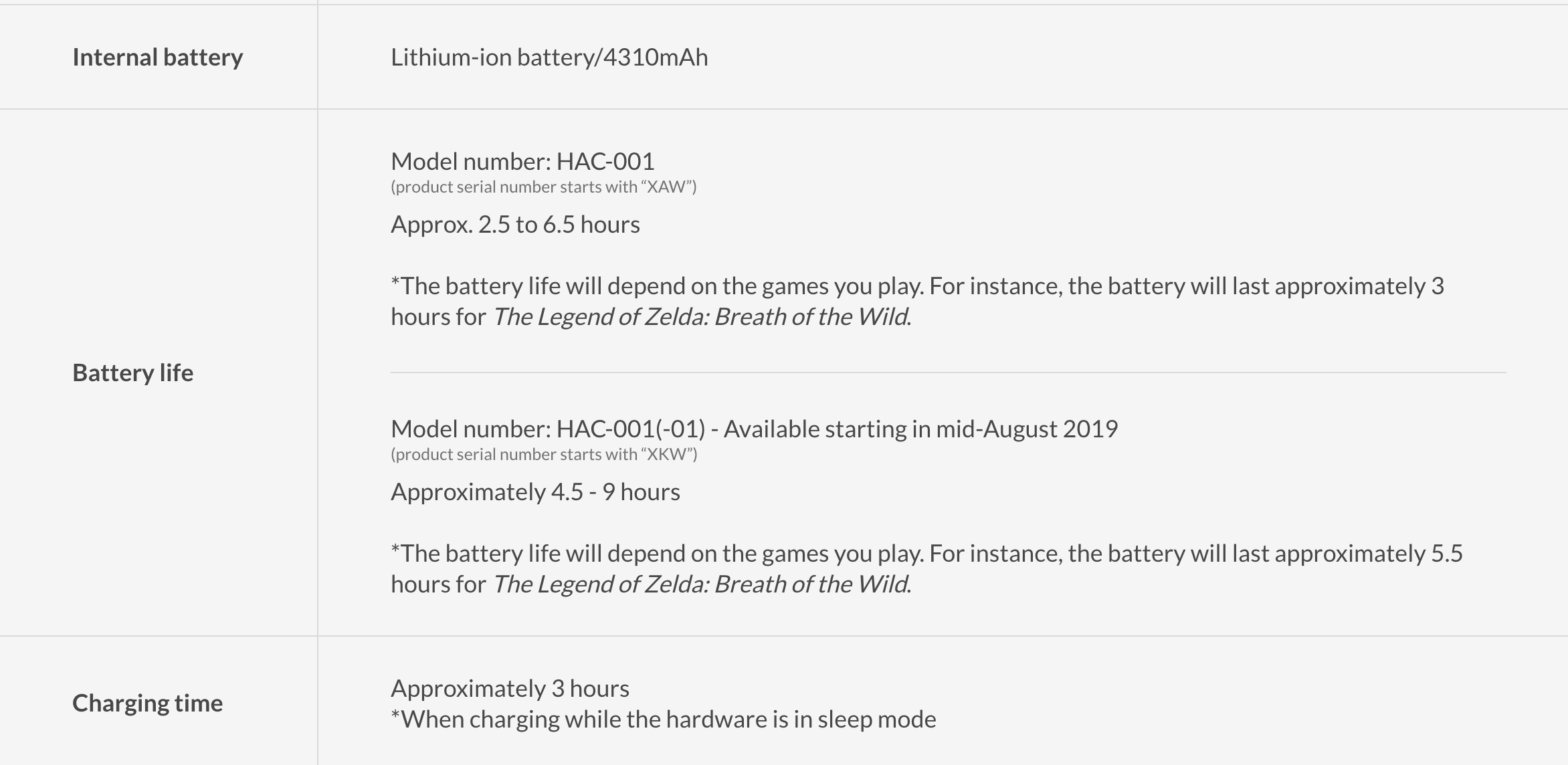 แต่ตอนนี้ Nintendo Switch ได้รับการปรับปรุงประสิทธิภาพแบตเตอรีแล้ว Nintendo จะออก Nintendo Switch ในรหัส (HAC-001(-01)) โดยมีระยะเวลาการใช้งานอยู่ที่ 4.5-9 ชั่วโมง ถ้าเล่น The Legend of Zelda: Breath of the Wild ในโหมด Handheld Mode จะอยู่ได้นานถึง 5.5 ชั่วโมง