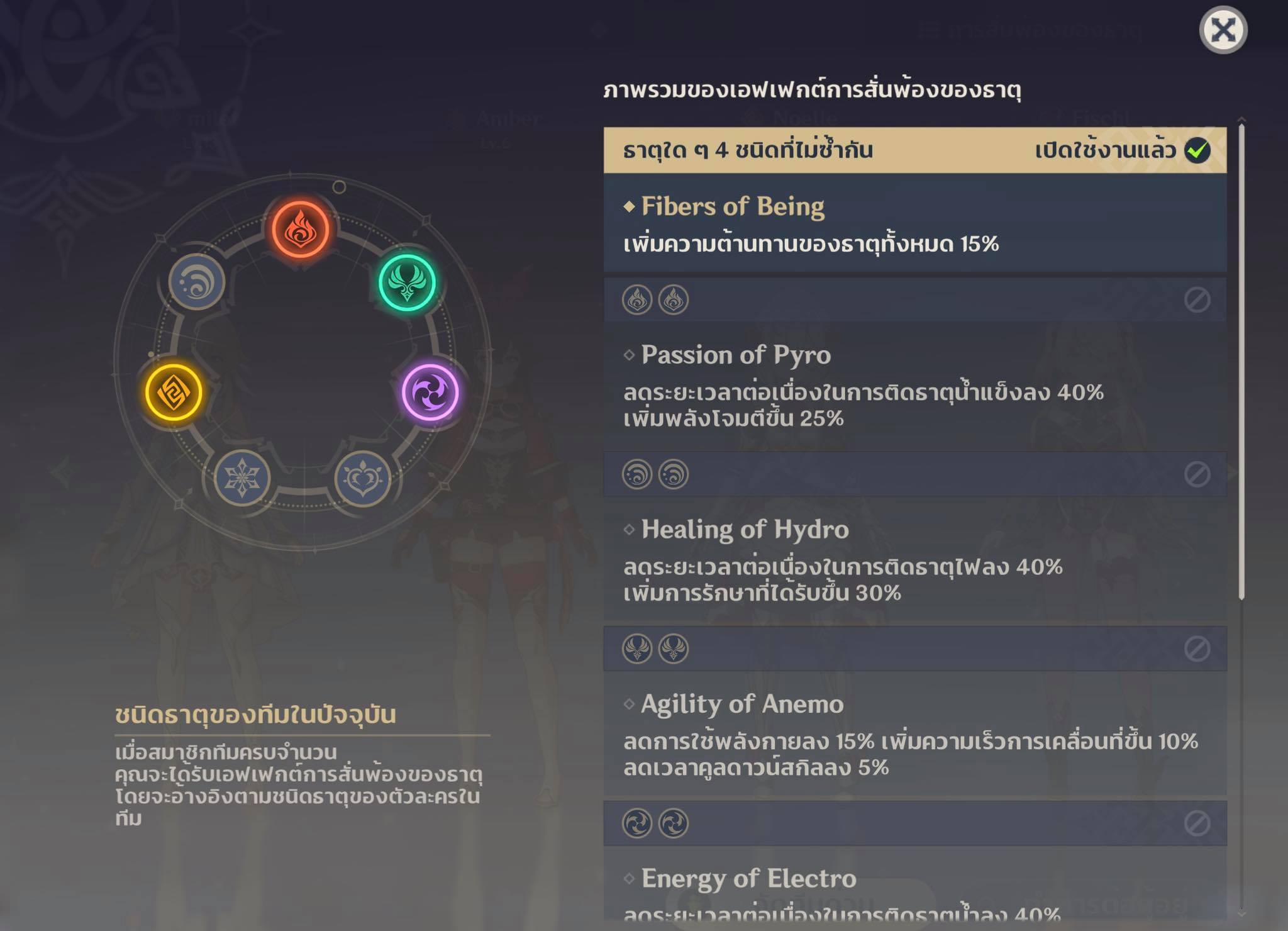 ( ผู้เล่นสามารถเข้าไปดูรายละเอียดตรงนี้ในเมนู “ตั้งค่าทีม” หรือ “Party Setup” ในฟังชันก์ “การสั่นพ้องของธาตุ” หรือ “Element Resonance” )