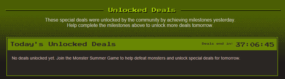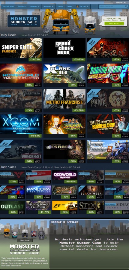 และ Summer Sale ปีนี้มีกิจกรรมพิเศษคือ กิจกรรม Monster Summer Game โดยจะเป็นเกมแนว Clicker ที่เราจะต้องคลิกเพื่อโจมตีเหล่ามนุษย์ต่างดาวที่มาบุก โดยเกมนี้จะสามารถเข้าร่วมเล่นกับเพื่อน ๆ ของเราได้อีกด้วย (แต่ค่อนข้างแลคซักหน่อยเพราะมีคนเล่นพร้อม ๆ กันมากกว่าล้านคน !!)