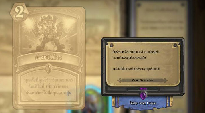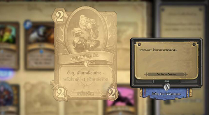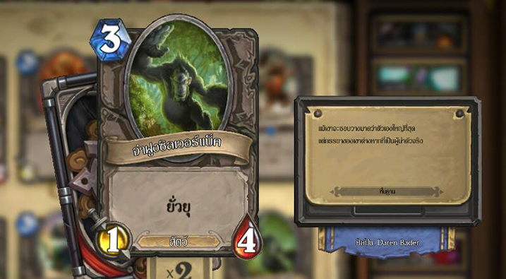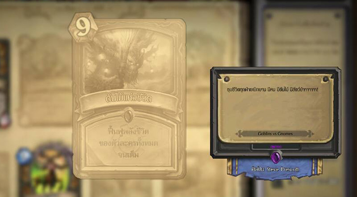 มาต่อกันที่ประเด็นสำคัญที่เราอยากกล่าวถึงการแปลภาษาไทยของเกม HearthStone นั้นบอกได้เลยว่าเด็ดจริง ๆ เพราะเจ้าการ์ดแต่ละใบในเกมนี้นั้นมีคำอธิบายที่ค่อนข้างแหวกแนวกว่าเกมการ์ดอื่น ๆ อยู่แล้ว แต่พอหลังจากทีม Translate ไทยมาแปลแล้วใส่มุกแบบไทย ๆ เข้าไป มันก็เลยออกมาเป็นแบบนี้…