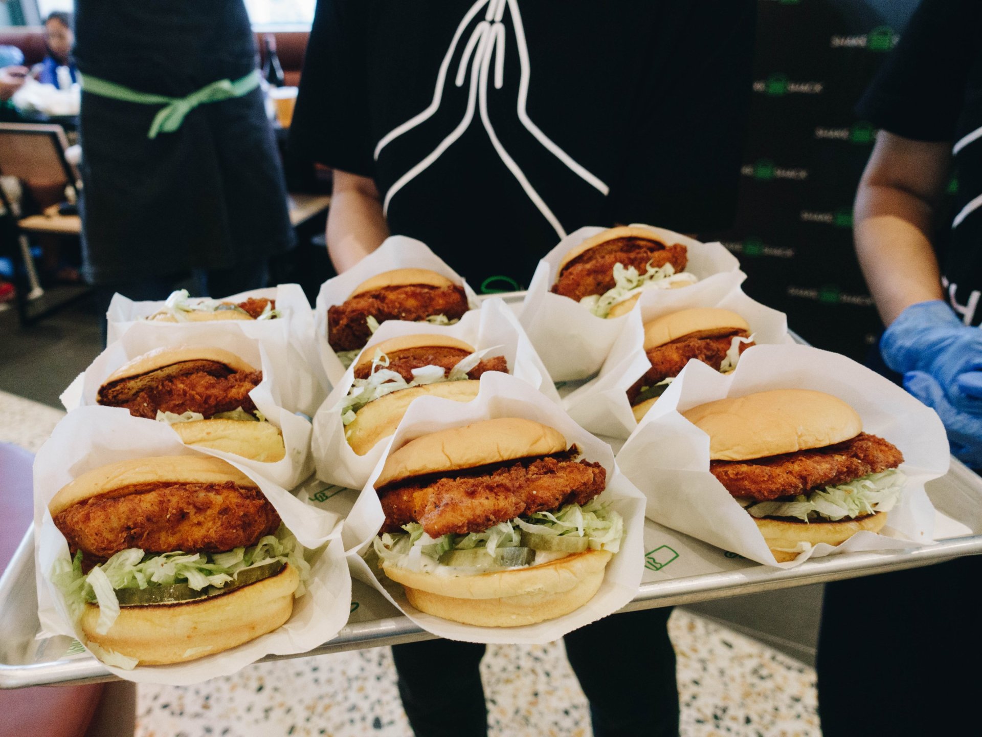 เราได้ลองเมนูที่ทางร้านคัดสรรมาให้เป็น 6 เมนู ตั้งแต่ แช็คเบอร์เกอร์ (ShackBurger®) หรือชีสเบอร์เกอร์ (ราคา 395 บาท) ที่ใช้เนื้อแองกัสนำเข้าใส่ซอสสูตรพิเศษของทางร้าน, และสำหรับคนไม่กินเนื้อก็มีชิคเก้นแช็ค (Chick’n Shack) เบอร์เกอร์อกไก่ทอด (ราคา 210 บาท) และฮอตชิคเก้นแซนวิช (Hot Chicken) เบอร์เกอร์สะโพกไก่ที่ทำไปซูวีด์ก่อนทอดกรอบรสจัดจ้าน (ราคา 230 บาท) ที่ได้ไก่ไม่มีฮอร์โมนจากไทยมาใช้เป็นวัตถุดิบให้เลือกรับประทาน