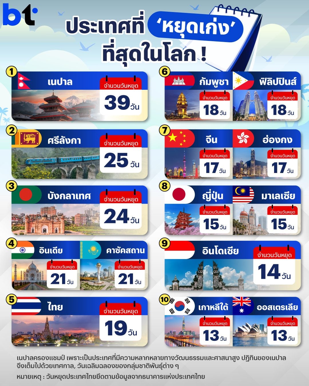 วันหยุดยาวใกล้เข้ามาแล้ว หลายคนอาจจะสงสัยว่าแต่ละประเทศเขาได้วันหยุดกี่วันกันบ้าง ? เพราะว่าประเทศไทยก็มีวันหยุดอยู่ไม่น้อยเช่นกัน วันนี้ BT beartai เลยจะขอพาไปดูว่าประเทศไหนมีวันหยุดประจำชาติเยอะที่สุดในโลก